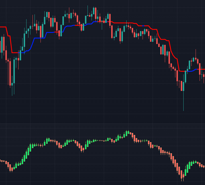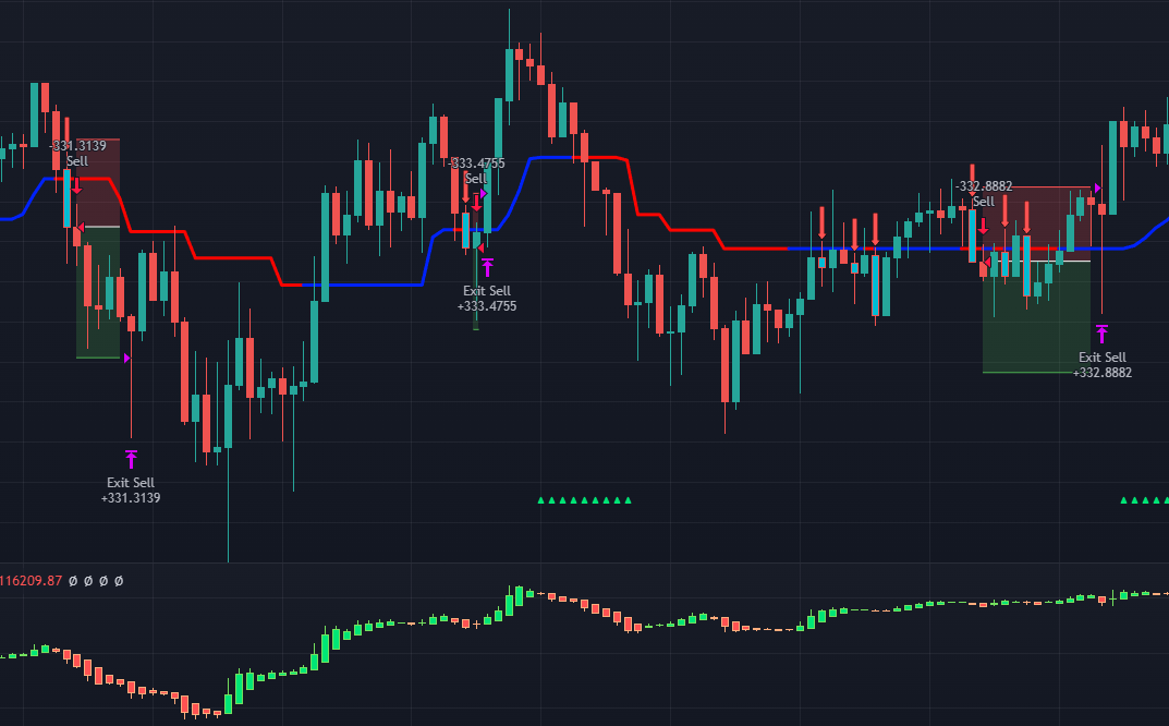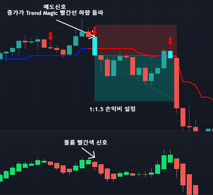차트의 Trend와 진입 신호를 주는 지표, 마찬가지로 초록색 매수, 빨간색 매도 시그널이다.