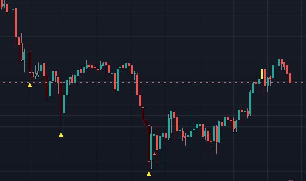 제작한 지표의 일부분이다[손매매용으로 제작했다] 노란 삼각형이 메인(단기)의 매수 타점이고, 빨간 삼각형이 한 타임프레임 위(장기)의 참고용 매수 시그널이다.